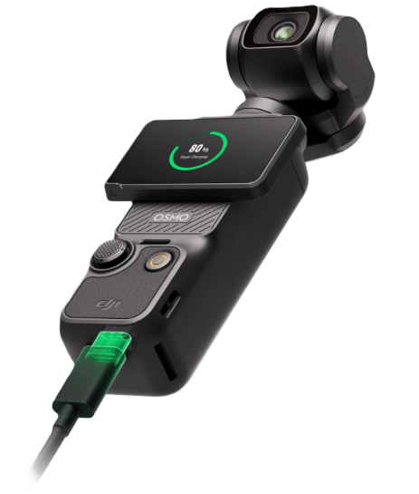 Pocket 3 can be charged to 80% in just 16 minutes [2], providing up to two hours of shooting. When fully charged, it can record up to 116 minutes of 4K/60fps footage or up to 166 minutes of 1080p/24fps footage [3], giving you more time to get the shots you love.